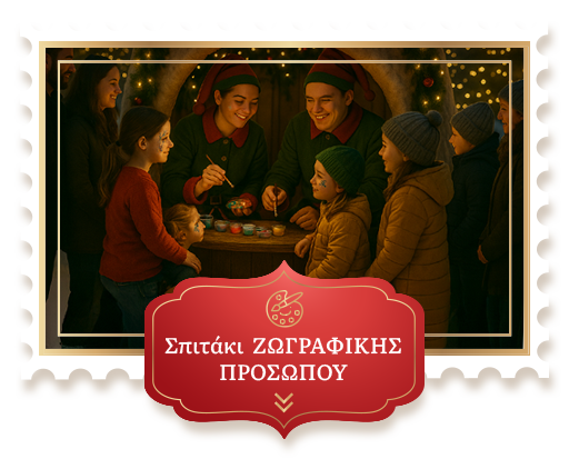 Σπιτάκι Ζωγραφικής Προσώπου Τα χρώματα ζωντανεύουν και μεταμορφώνουν μικρούς και μεγάλους σε ξωτικά, νεράιδες, ταράνδους και ήρωες των γιορτών! Διάλεξε το σχέδιο που σου ταιριάζει, χαμογέλα, και άφησε τους καλλιτέχνες…