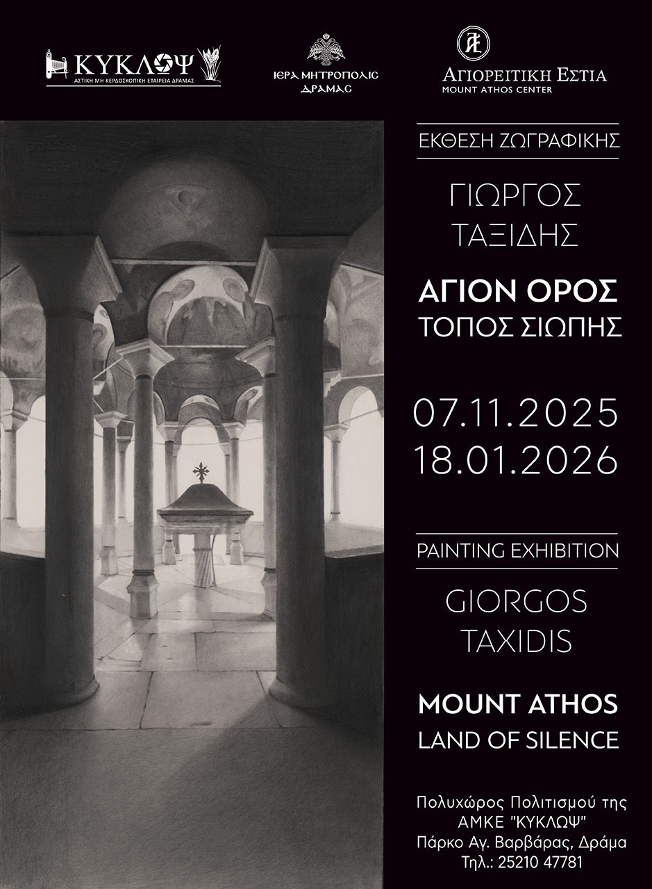 η έκθεση ζωγραφικής «Άγιον Όρος. Τόπος σιωπής» του δραμινού ζωγράφου Γιώργου Ταξίδη, σε συνεργασία με την Αγιορείτικη Εστία και την Ιερά Μητρόπολη Δράμας.